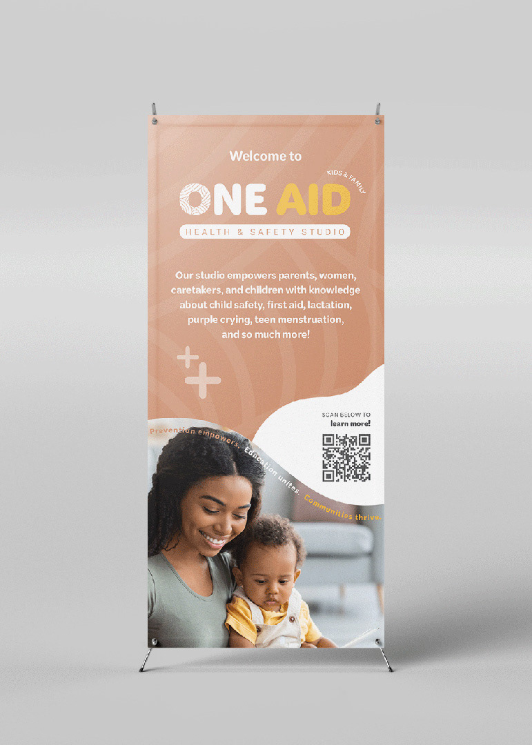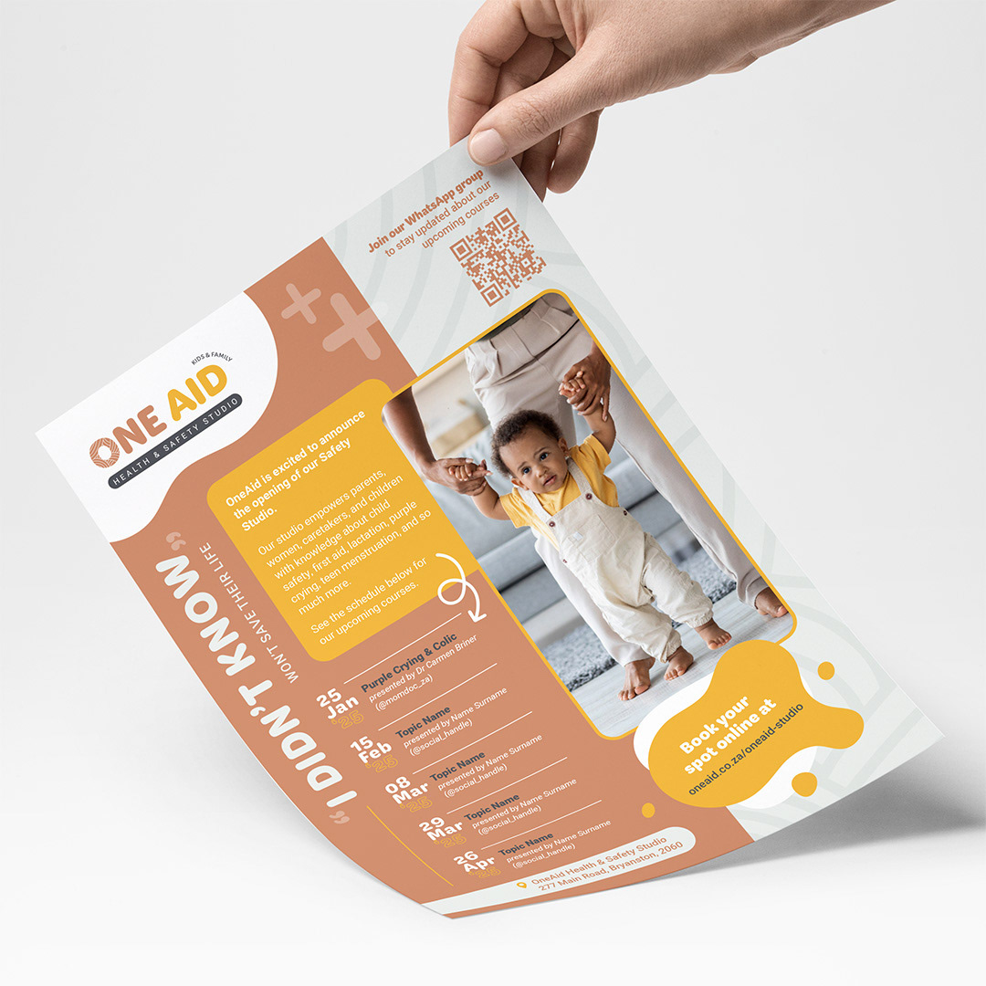 OneAid Health is a family medical centre founded by Dr. Carmen Briner, bringing together a diverse team of healthcare practitioners dedicated to comprehensive care. Beyond medical services, OneAid Safety offers specialised training courses for parents and children, including first aid, puberty education, prenatal classes, and more. The brand was thoughtfully developed to seamlessly complement Dr. Carmen’s brand, reflecting her commitment to holistic family health and education.
